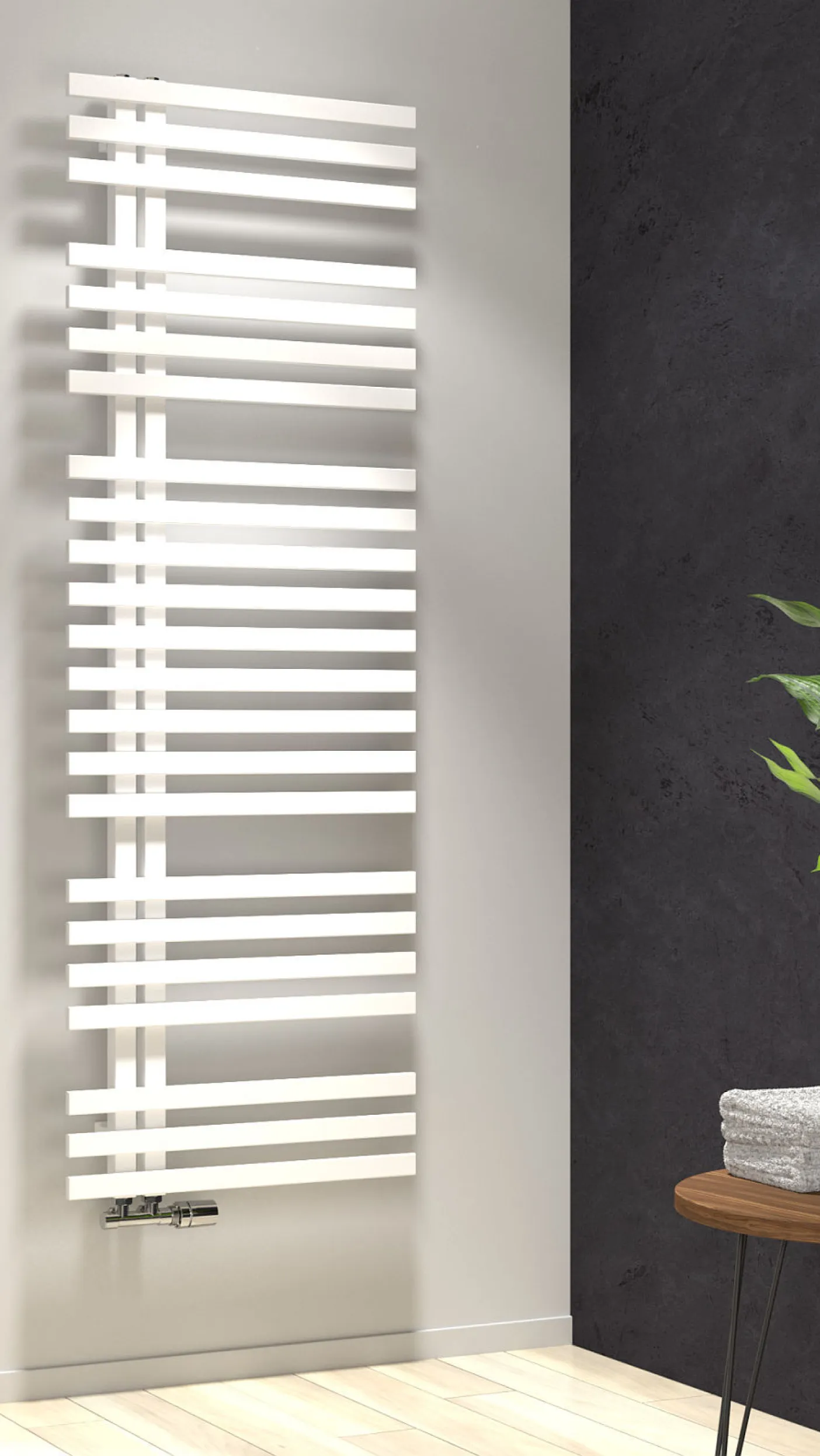 Ein besonderes Detail: Der Linie Plus verfügt über vereinzelt vorstehende Heizsprossen, auf die sich Handtücher zum Vorwärmen seitlich aufschieben lassen. Dadurch wird der Heizkörper nicht verdeckt und kann bei gleicher Heizleistung Badezimmer und Handtücher aufwärmen.