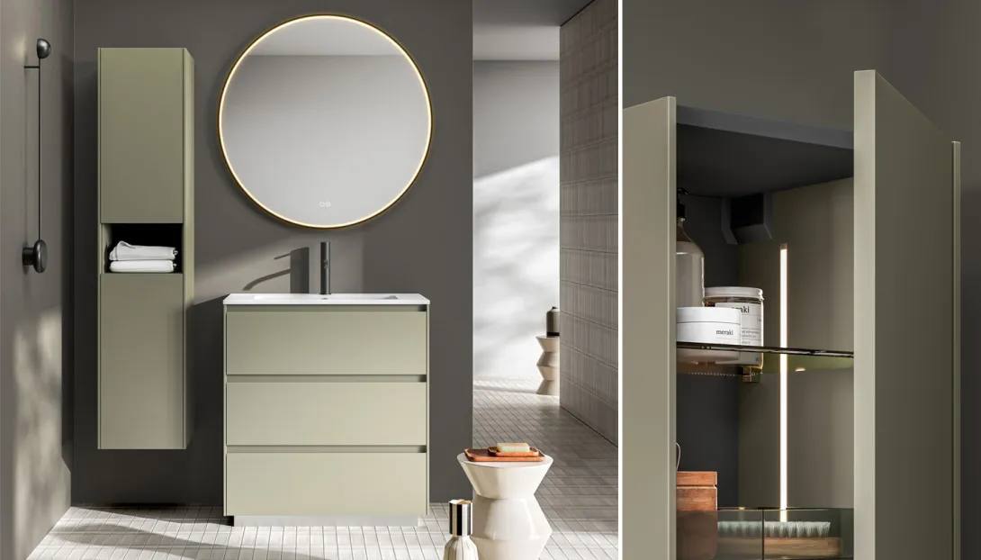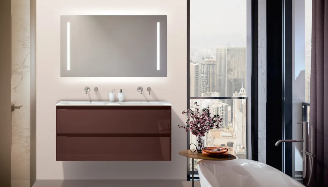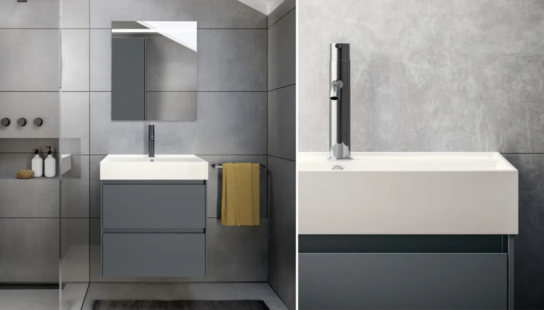 Ein schlankes Seitenprofil zeichnet eine feine Kontur entlang des Schranks und verleiht der Kollektion ihre unverwechselbare Signatur. In Kombination mit hohen Waschtischen oder Waschtischplatten aus Keramik, Ceramilux oder Mineralmarmo entsteht ein stimmiges Gesamtbild mit hohem funktionalem Anspruch.
